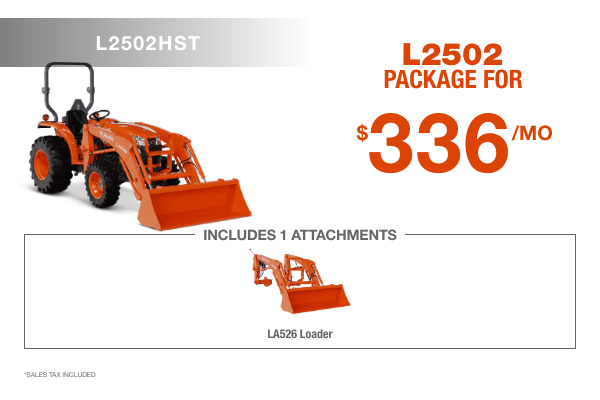 Get your L2502HST tractor package for as low as $336/mo with approved credit.